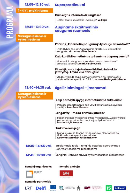 Pradinukai, aukštesniųjų klasių moksleiviai, gimnazistai, suaugusieji ir vyresnieji, junkitės prie didelio susidomėjimo sulaukusios „Skaitmeninės bangos“, apsaugokite save, artimuosius ir susidraugaukite su naujausiomis technologijomis. Renginio metu sužinosite, kaip stiprinti atsparumą melagienoms, internetiniams sukčiams, kaip įveikti trolių ir botų legioną, kaip valdyti dronus, kaip per metus patobulėjo dirbtinio intelekto įrankiai, kaip jais naudojantis kurti ir šį technologijų pasaulį suderinti su tvarumu, pasirūpinti savo fizine, psichologine sveikata ir ilgaamžiškumu. Programa